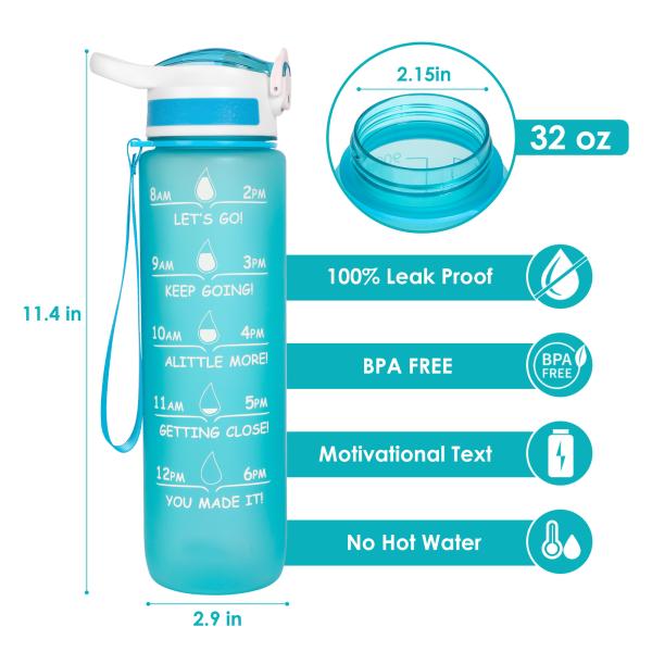 2: Our 32 oz water bottles, made of quality food grade eco-friendly reusable leakproof plastic, this water bottle is 100% BPA & TOXIN FREE, odor free and healthy for your daily water drinking. Perfect for gym, workout, office and outdoor recreations.